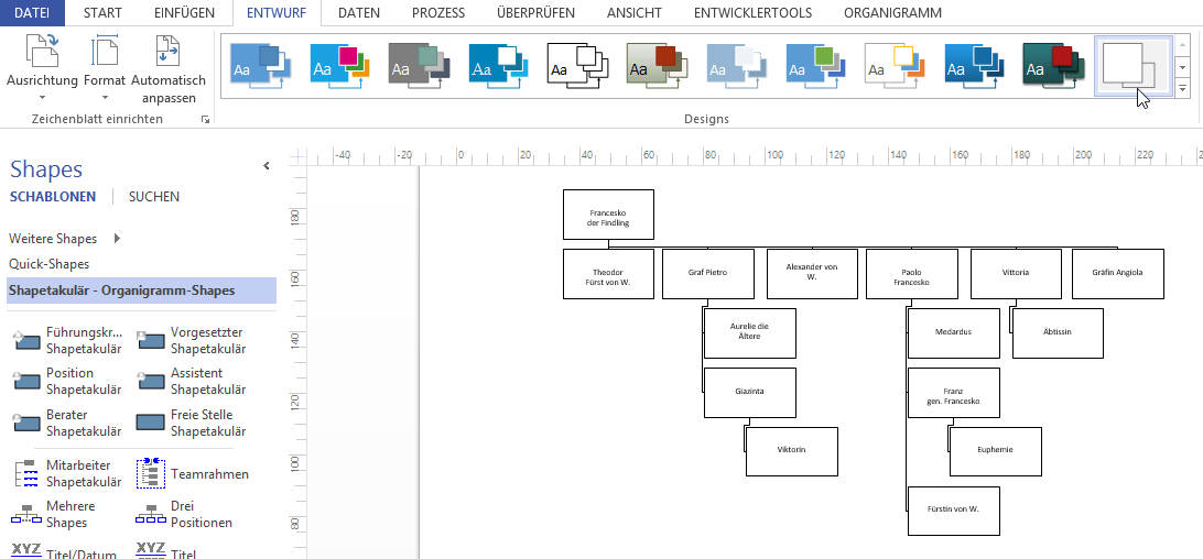 Hintergrund: Ich möchte die Funktionen (Ribbon-Registerkarte) aus der Organigrammerstellung, Brainstorm… in einer Datei benutzen können und die dazugehörigen Diagrammtypen.
