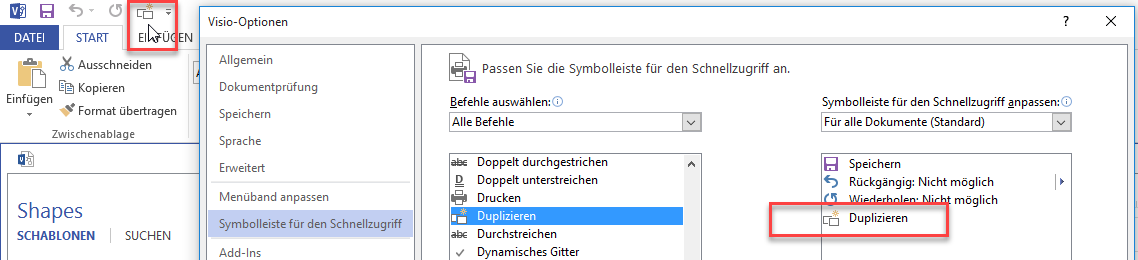 In Visio 4.0 gab es immer im Kontextmenü, also dem Menü, das sich öffnet, wenn man die rechte Maustaste betätigt, die Option, neben „Einfügen“ und „Kopieren“ die Option „Dublizieren“ auszuwählen.